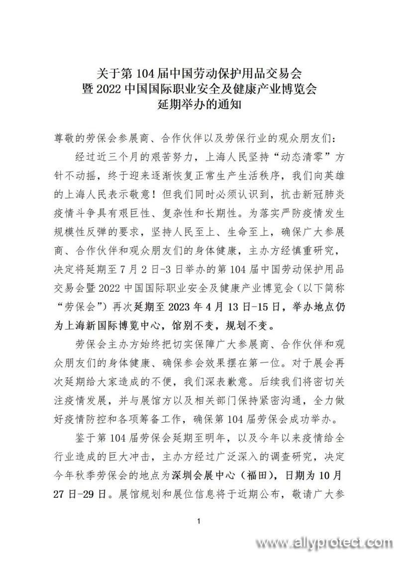 勞保會主辦方始終把切實保障廣大參展商、合作伙伴和觀眾朋友們的身體健康、確保參會效果擺在第一位。對于展會再次延期給大家造成的不便,我們深表歉意。后續(xù)我們將密切關注疫情發(fā)展,并與展館方以及相關部門保持緊密溝通,全力做好疫情防控和各項籌備工作,確保第104屆勞保會成功舉辦。