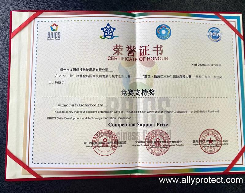 梧州市友盟焊接防護(hù)用品有限公司榮獲2020年一帶一路暨金磚國家技能發(fā)展與技術(shù)創(chuàng)新大賽競賽支持獎(jiǎng)。AP友盟將不遺余力的支持國家一帶一路發(fā)展的宏偉戰(zhàn)略。