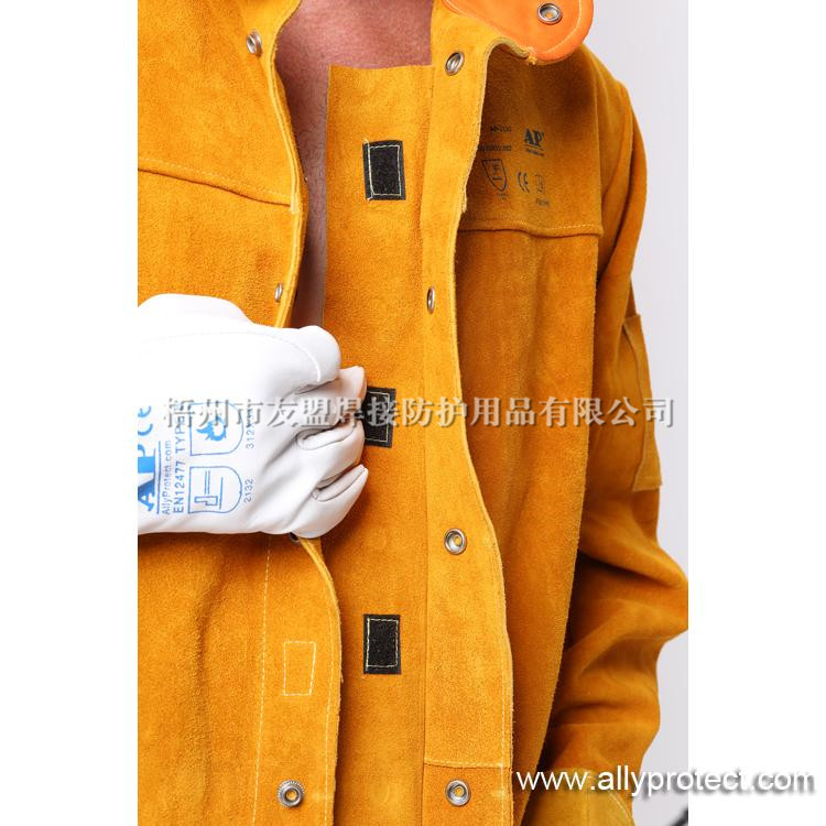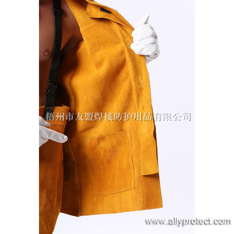 - 產品描述: [ AP ]金黃色牛二層芯皮全皮上身焊服,能夠在焊接飛濺嚴重的環(huán)境中,給使用者的身體提供安全有效的保護。